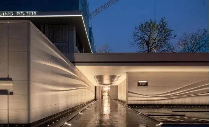 稍微走近一点就能看到采用了大量的弧形元素和石材材料。✅康定壹拾玖售楼处电话:400-8787-740 ✅✅石材的质感本身就厚重,在上面叠加类似海浪的线条弱化了厚重感,反而显得轻盈。