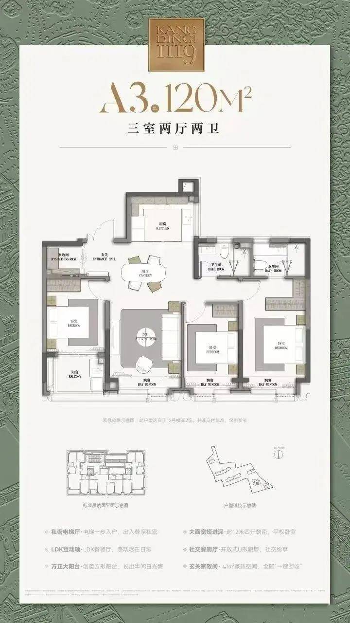 建面约120㎡三房户型,✅康定壹拾玖售楼处电话:400-8787-740 ✅✅适配南北动静分区结构,是臻藏老静安资产的性价比之王;