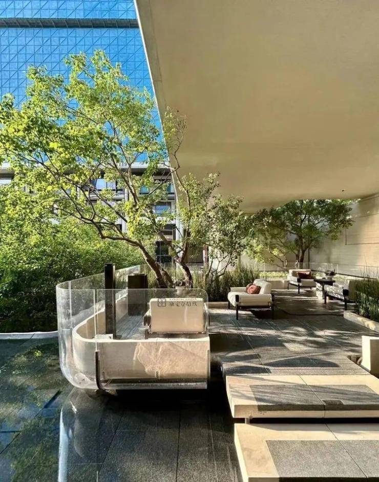 从会所内部往外看,直面的是整个下沉式庭院,✅康定壹拾玖售楼处电话:400-8787-740 ✅✅最适合就着背景放着爵士乐,聊天、喝酒了!