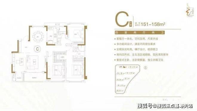 建面约151-158㎡四室两厅两卫户型特点:客餐厅一体化,空间实用,尺度开阔;多功能间设计,满足不同居住需求;全明采光布局,横厅设计,明厨明卫;南向四开间,主生活区域朝南,阳光清风常伴;套房式主卧,主卧带飘窗,独立衣帽卫。