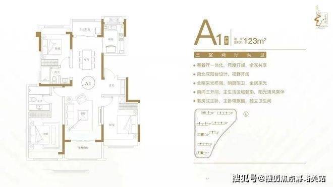 建面约123㎡三室两厅两卫户型特点:客餐厅一体化,尺度开阔,全家共享;南北双阳台设计,视野开阔;全明采光布局,明厨明卫,全房采光;南向三开间,主生活区域朝南,阳光清风常伴;套房式主卧,主卧带飘窗,独立卫生间。