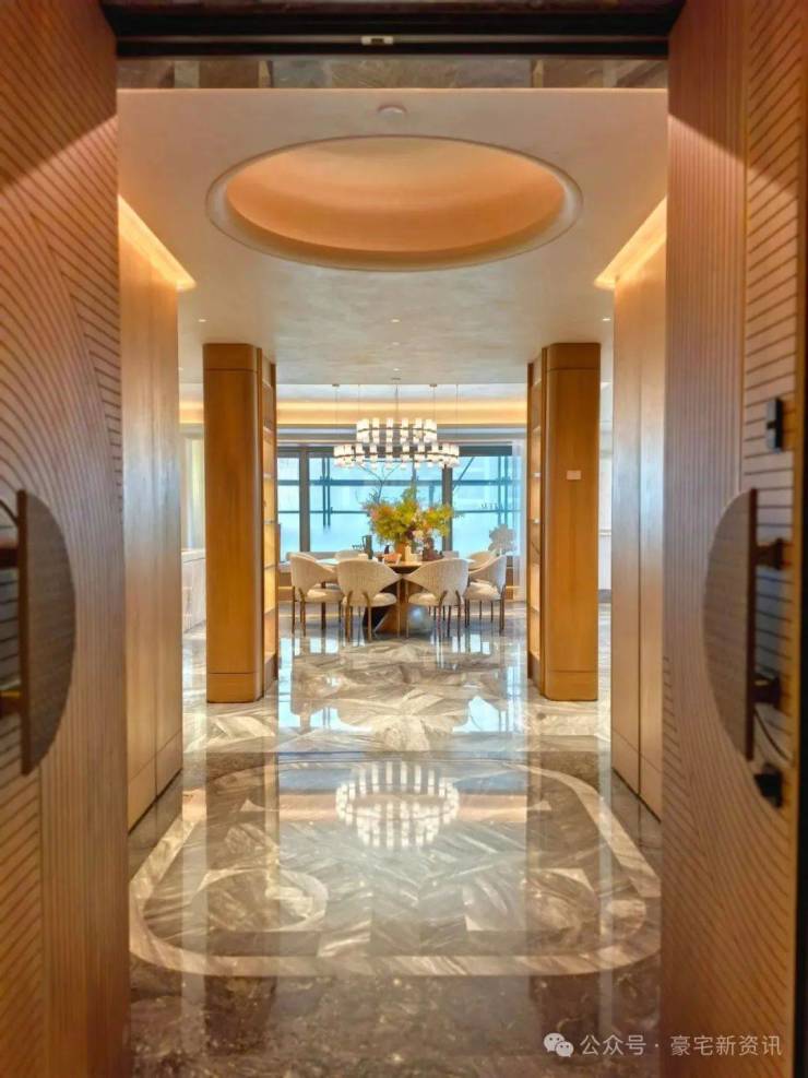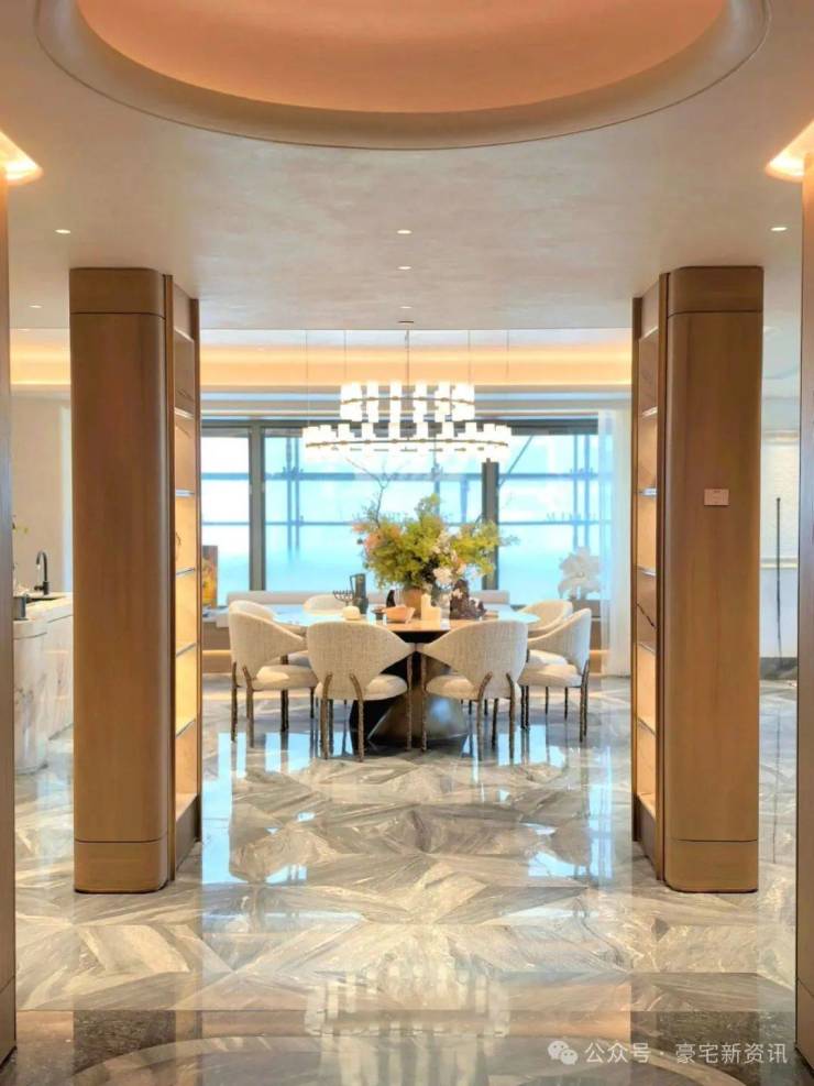 住宅立面颜色以珍珠蓝为核心,搭配香槟金、海派红,两侧还采用弧形设计,比方正的建筑看起来更柔和,也让视野更大化,实现约270°观景。