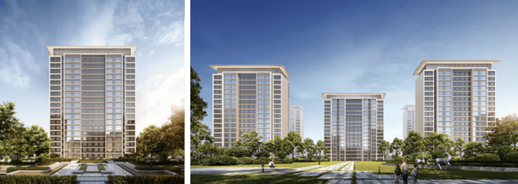 主题风格:外立面采用经典时尚现代主义风格,通过温和的色彩搭配、简练的横向线条、黄金比例的立面比例、极简抽象的建筑符号、建筑顶部的飘板,呈现一个现代风格和艺术气质结合的高品质社区。
