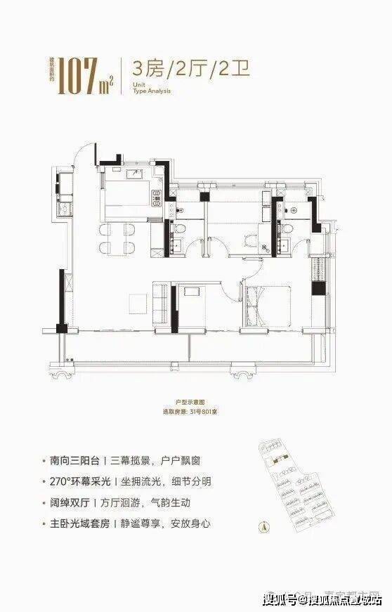 大华星屿建面约107㎡户型南向2个大阳台的合计建面接近16㎡,远超新规标准。如果再算上飘窗附赠以及电梯厅延伸空间,可使用率接近100%!(非得房率,最终房屋得房率以实测报告为准)同时建面约107㎡户型做到做到了约5米超大宽厅设计,3.5南向面宽+南北通透的格局让采光通风效果俱佳。主卧套房配置,朝南次卧面宽约3.2米外接阳台,朝北带大飘窗,做到了真正的大三房功能,每个空间的尺度都远超同面积段区域其他产品,妥妥的明星户型!