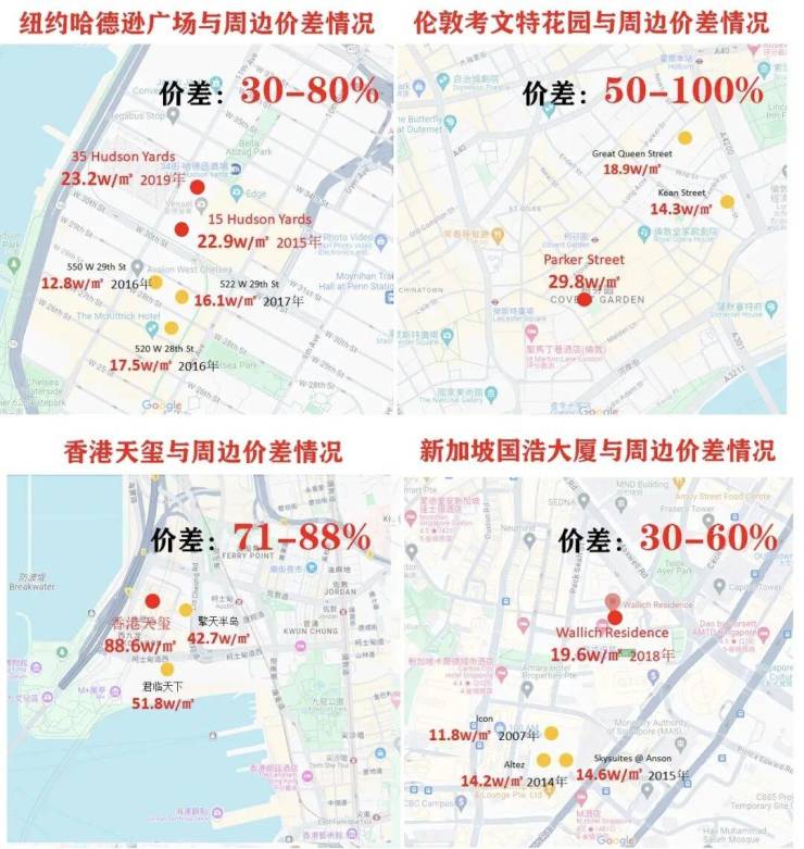 我们来看几个享誉全球的成功案例,纽约哈德逊广场,伦敦考文特花园,新加坡国浩大厦,香港天玺,这些顶级公寓都有一些共性点: