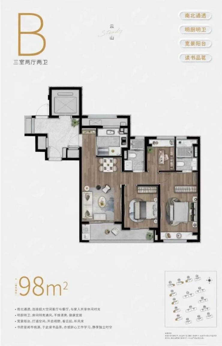 实用性方面,户型3房3卫、南向双套房的设计,可以保证每个家庭成员都能拥有更具私密性的居住空间。