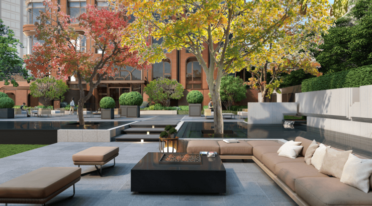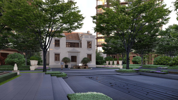 上海壹号院还拥有丰富的景观及生态资源,项目外部双公园环绕,内部约 1.8 万方海派公园,十字景观轴串联多元景观,四季景致各异,步移景换,这样的配置在寸土寸金的新天地旁尤显珍贵。