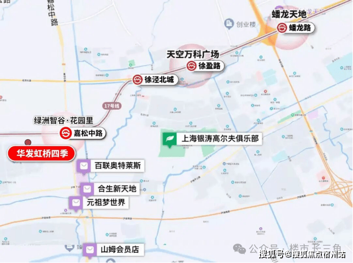 华发虹桥四季直线距离17号线嘉松中路站仅约700米。从嘉松中路站出发2站即到徐盈路站(天空万科广场)、3站蟠龙路站(新开业的蟠龙天地)、4站诸光路(国家会展中心)、5站虹桥火车站(虹桥商务区)并无缝换乘2号线、10号线。