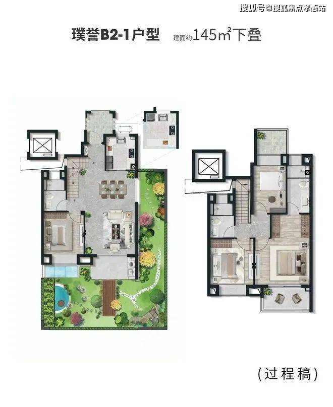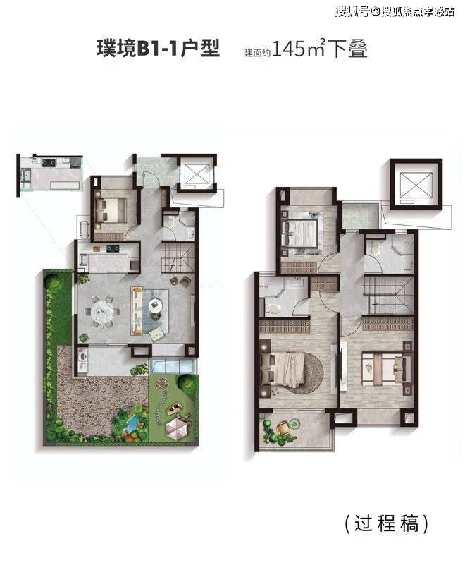 另外,还可以选择B2-1户型建面约145㎡下叠,面积上与B1-1户型相同,功能区也大致相似。