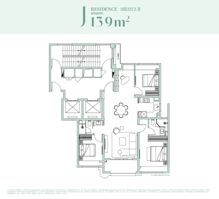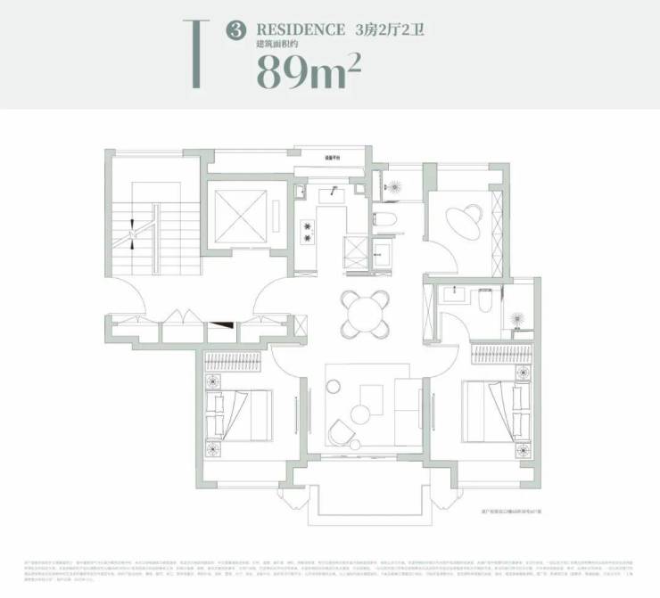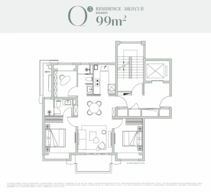 厨房、餐客厅、阳台形成直线通风廊道,南向三开间+宽尺客餐厅,轻松容纳二胎三代家庭的日常;