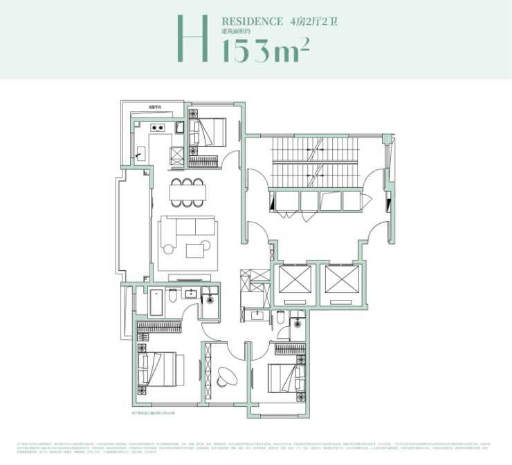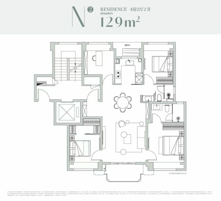 该户型是经典的四叶草布局,四开间分布在四角,兼顾私密与互动,是二胎家庭的优选;