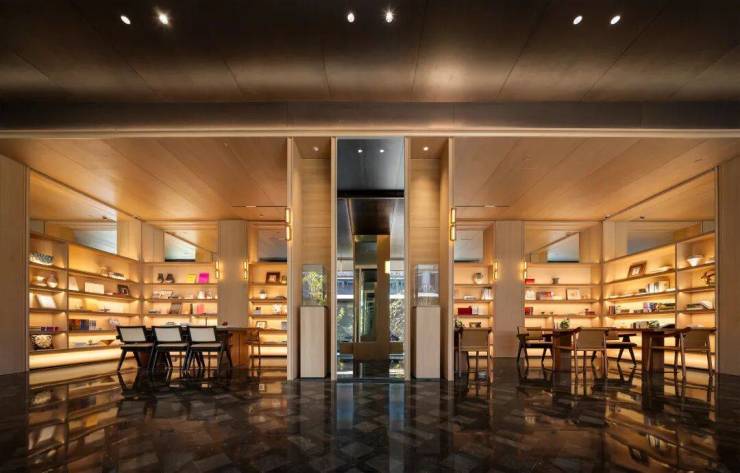 公区方面,西入口正对一棵挺拔的泰山油松、灵动的水景、与艺术感的屋檐共同构成一座现代语境下的“玲珑宝盒”,营造出从喧闹到宁静的情绪转换。