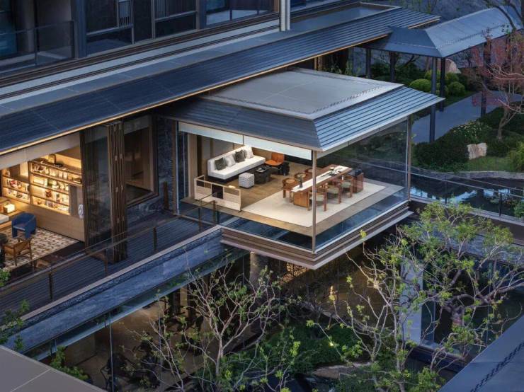 在三面悬空,像是悬浮在水景之上的悬亭茶室,是观看下沉庭院景观的最佳位置。无论是喝茶、聊天还是聚会,都是绝好的场所,业主面子直接满级。