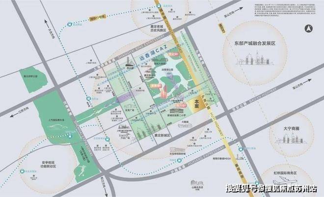 一条沪宜公路,贯连嘉定南北,通过这条大动脉往南能迅速接驳沪嘉高速、嘉闵高架,通达大宁、虹桥、真如等城市CBD。往北则链接远香湖CAZ,聚集嘉定新城的城市资源精粹。