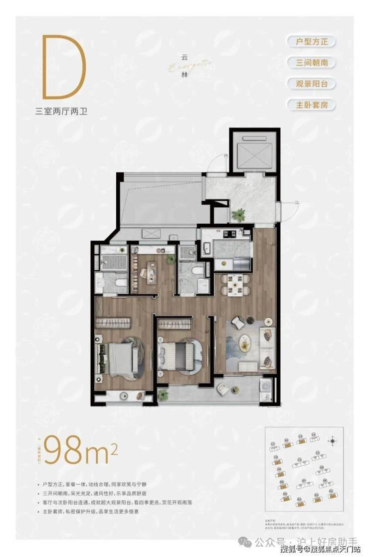 约98㎡3房2卫户型,三开间朝南,并且这贯穿客厅+次卧的超大阳台实在是惹眼,这个南向的视野延展度以及采光度相比同级别的户型来说,要更加出色。