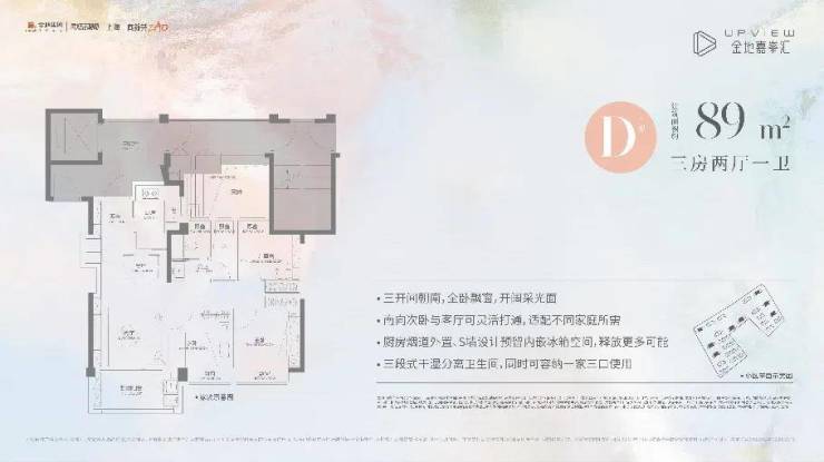 建面约89㎡三房两厅一卫(D户型),不仅功能完备,而且很好地把控了总价,约350万起即可上车高配品质三房,堪比市场上110平左右的空间感!