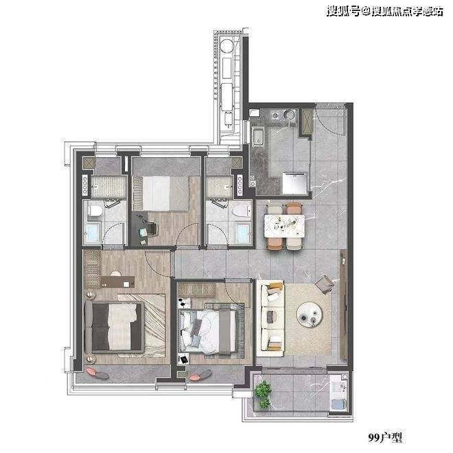 建面约99㎡的3房2卫设计,各个空间的尺度感更大,主卧套房设计,保证了主人的私密空间。