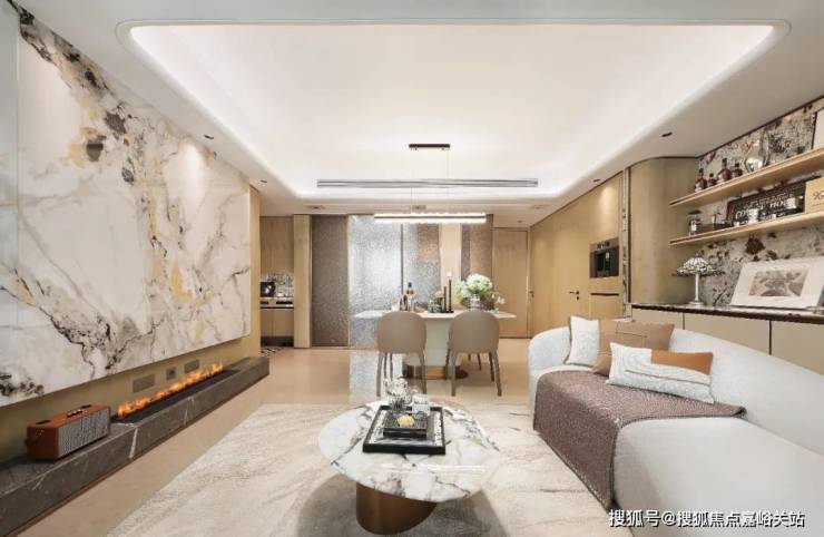 其二, 含“奢石量”超高 ,审美质感在线。客厅地板选用土耳其进口石材,主卫台面为云顶白石材,玄关台面采用 雪山银狐奢石 。