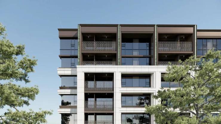 洋房立面以大面积干挂石材结合金属饰面为主基调,营造出现代典雅的整体风格。