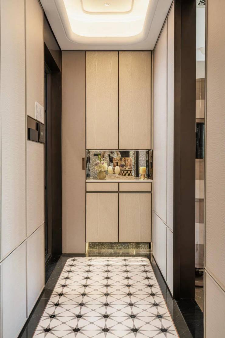 入户石材拼花:玄关地面以三种天然石材手工拼花工艺打造,通过材质肌理的碰撞与几何纹样的对称,营造媲美五星级酒店大堂的仪式感,材质等级对标顶豪项目。