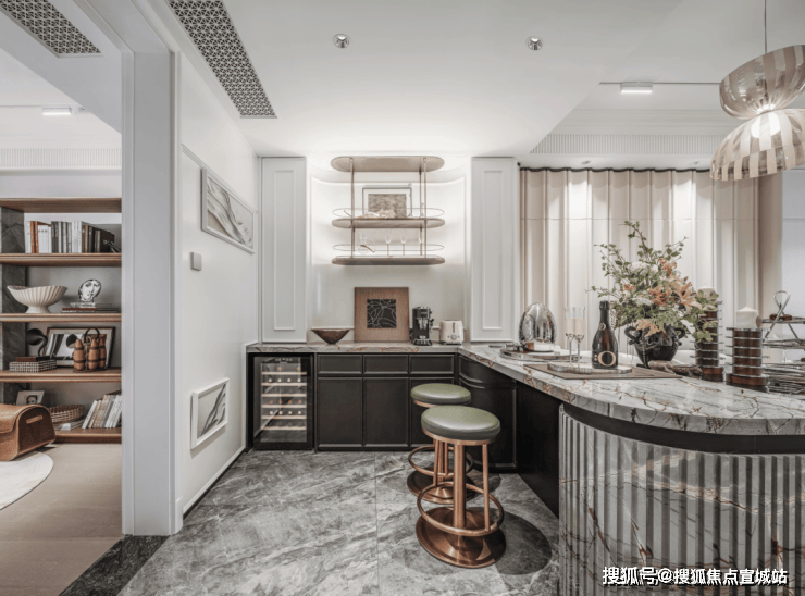 公区打造更是媲美奢华酒店,不仅有颜值,更有着满满的仪式感。嘉佩乐酒店风格的归家门厅,海派元素充满空间的每一个角落,地面的复古花纹,金属镂空装饰墙,普拉达绿的奢石点缀,仿佛穿越到了摩登时代。
