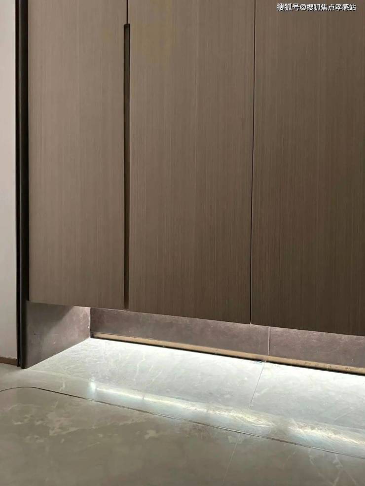 鞋柜下方做了悬浮处理,同样也是内嵌灯带,这里灯光的角度还会再调整,因为灯光映射在大理石地面上,要显得尽量柔和不刺眼;同时,鞋柜下方可放拖鞋,还能放扫地机器人,便于日常清扫打理。