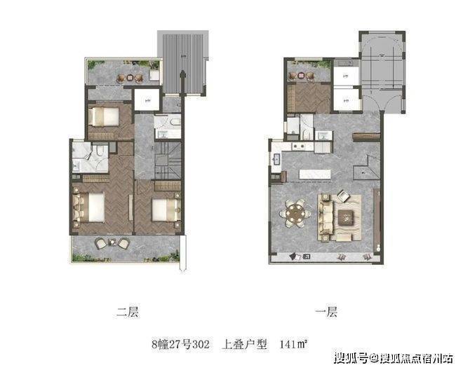 以建面约141㎡上叠户型为例:格局与下叠基本相同,约7.2米的横厅,客厅局部挑空。北向的储藏室附带阳台(阳台可打通,改造成北向房间),二层则拥有南北双露台。