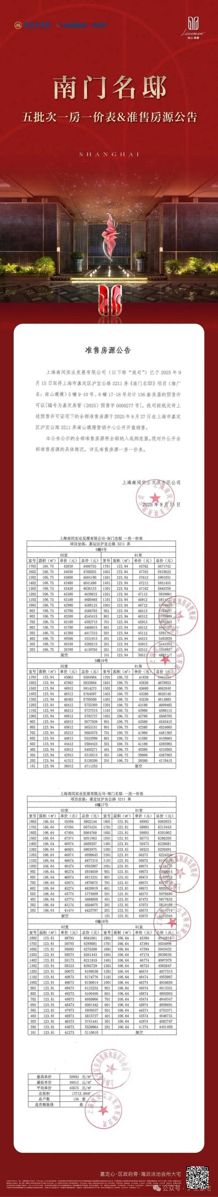 最新消息:南山璞缦项目五期加推105-123㎡3房户型,共136套房源,过会均价均价45675元/㎡;另前期少量105-198㎡3-4房在售,总价365万起,可直接认购!作为嘉定新城封面豪宅产品,项目备受购房者的关注!
