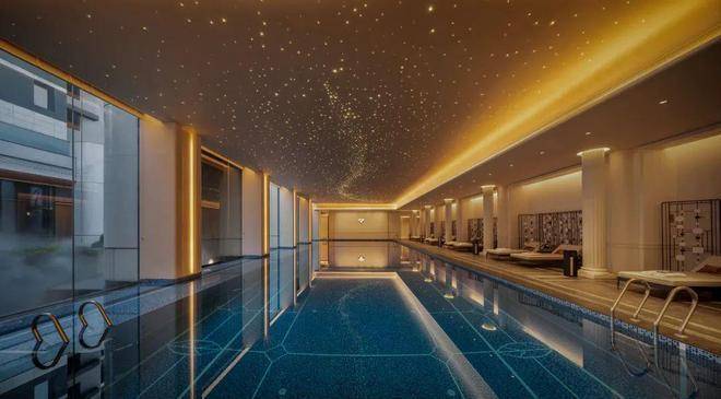泳池采用637259块纯手工铺贴的独一无二专属定制ARTDECO美学拼花马赛克+纯天然优质石材打磨的罗马柱定制的星空顶无界恒温泳池,实现足不出户尽享法式惬意优雅。