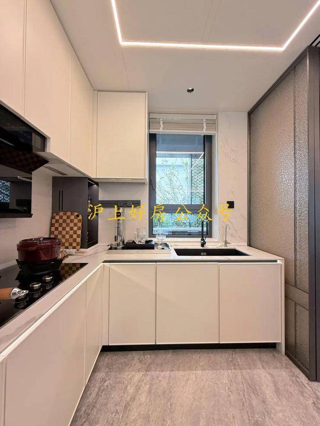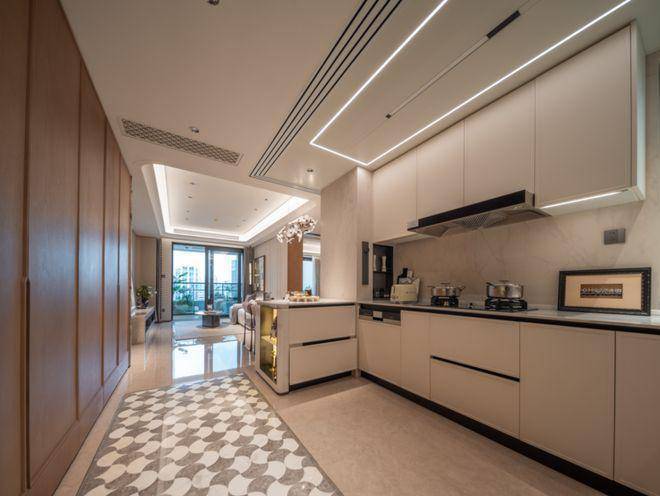 进门可以看到经典的S墙设计,L型厨房操作台面,也是暗藏不少细节——玻璃移门采用完美系列夹丝玻璃+金属造型边框,顶部配置线性凉霸+LED嵌入式回形灯带+筒灯,灶台后侧采用大面积岩板铺设,方便清洁的同时显得厨房更加大气。