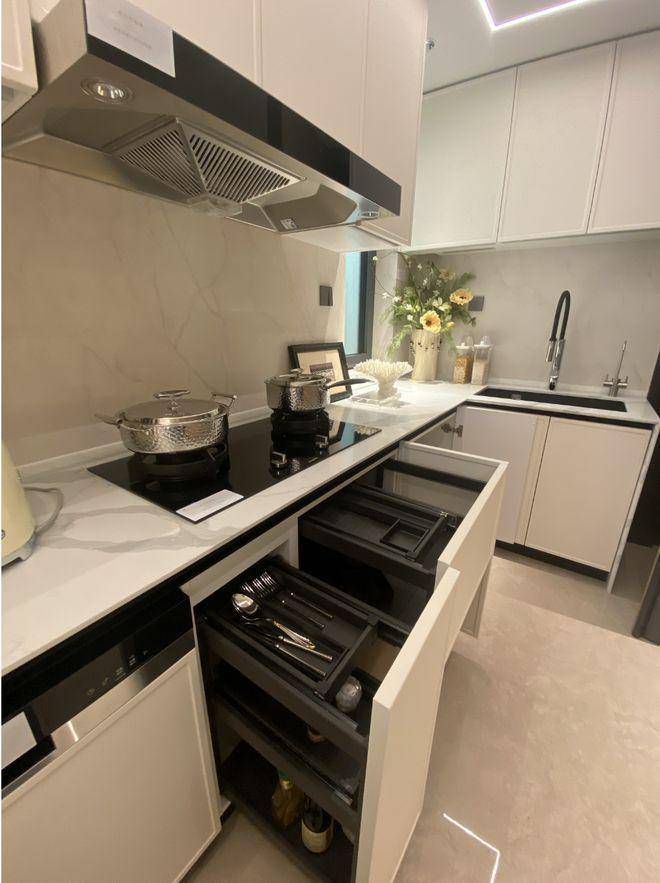柜门白色烤漆面板,抽屉分区也都是帮大家细致划分,如多功能调味拉篮+谷物抽+碗碟拉篮等。岛台上配置可升降插座,铝合金抽屉,石材背景板的金属开放格实用性很强。