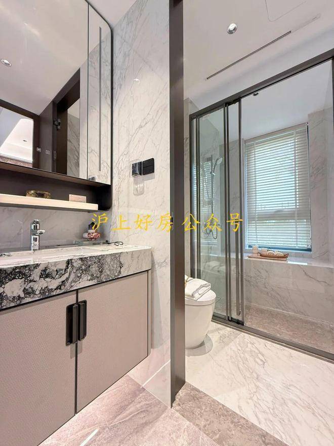 奢石台面,皮革饰面柜抽屉,侧端设置金属收纳开放格;定制镜柜,中间的透光玉石直接提升了高级感,镜柜内部配备了美妆冰箱+美妆灯条+轨道收纳!