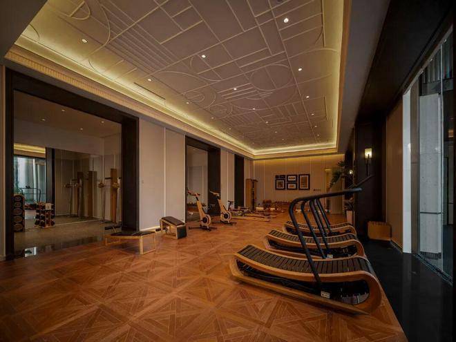 轻法式风格高定瑜伽室,镜面雕刻暗藏巧思,以现代化手法演绎ARTDECO图形元素,延续健身空间美学。