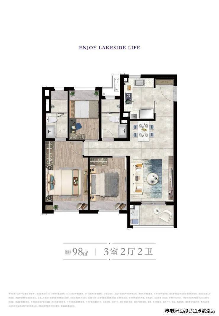 建面约98㎡3房2卫格局非常方正,每卧空间利用率高,三房都能做成卧室。