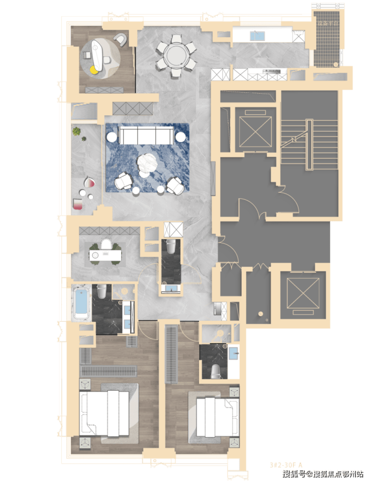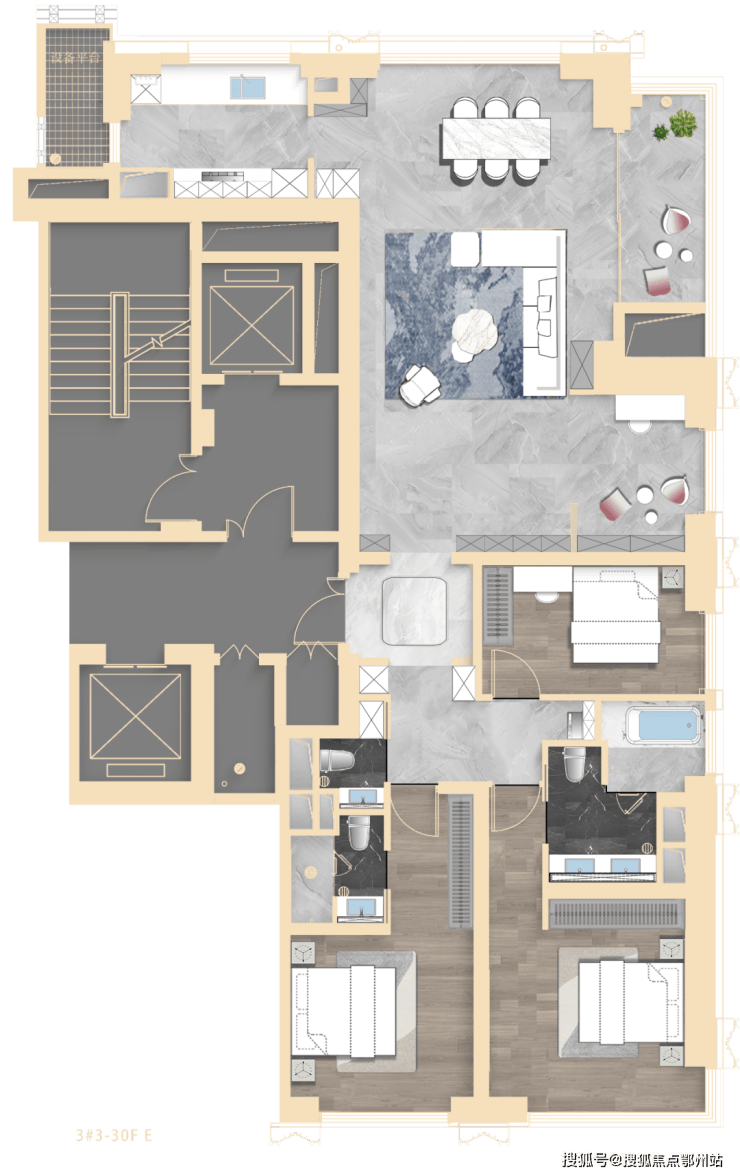 其中3#为超高层,北向可观小区绿化和苏河景观,高区可瞰三件套盛景。