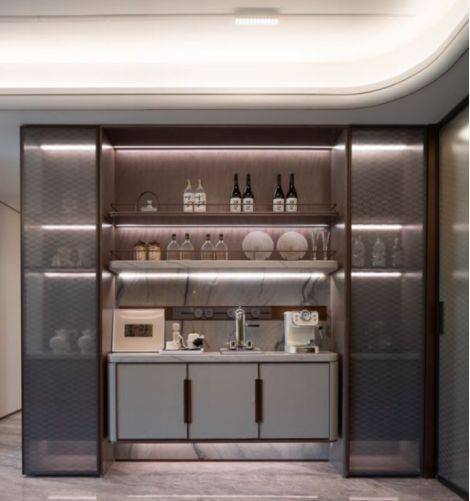 在交付配套之中高阶定制餐柜空间,提供更多收纳空间之外,也增加空间视觉层次。保利海上瑧悦售楼处电话400-8787-740☑️☑️