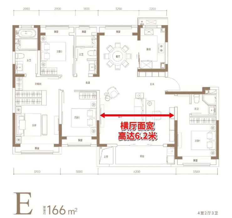 其中,建面约166㎡户型享独立门厅入户,尊贵感、实用性兼具。客厅横厅布局,面宽高达6.2米,配约8㎡大阳台(不封阳台,算一半面积),社交区域方正、阔绰,待客、休闲皆从容自在。