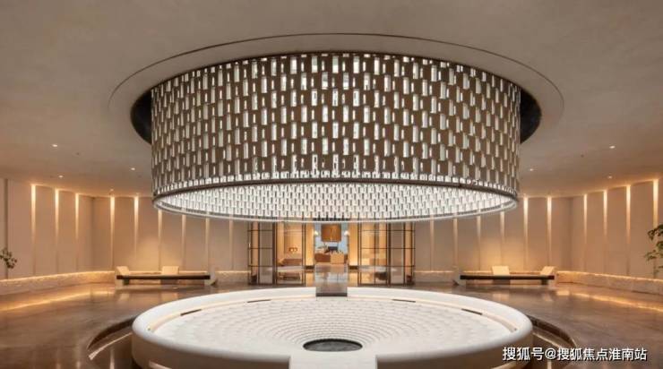 浮光池院水院会客厅,现已实景呈现,水景中央的艺术小品,如一滴水在湖面晕开,泛起阵阵涟漪。