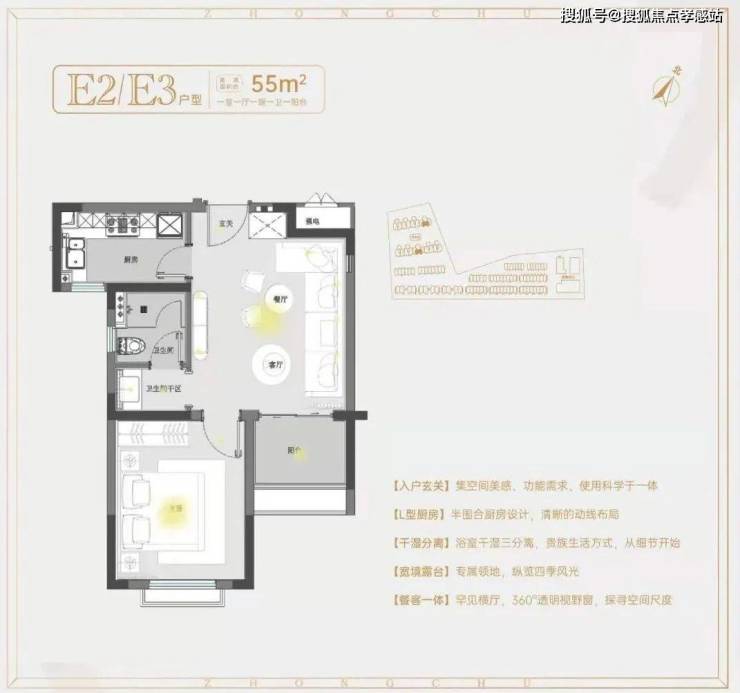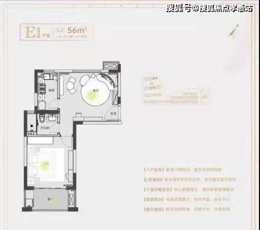 建面约55㎡1房1卫户型,低总价优质上车小户型,做到了双开间朝南+卫生间干湿分离+卧室带飘窗+客餐厅相连,小而美的一个户型。