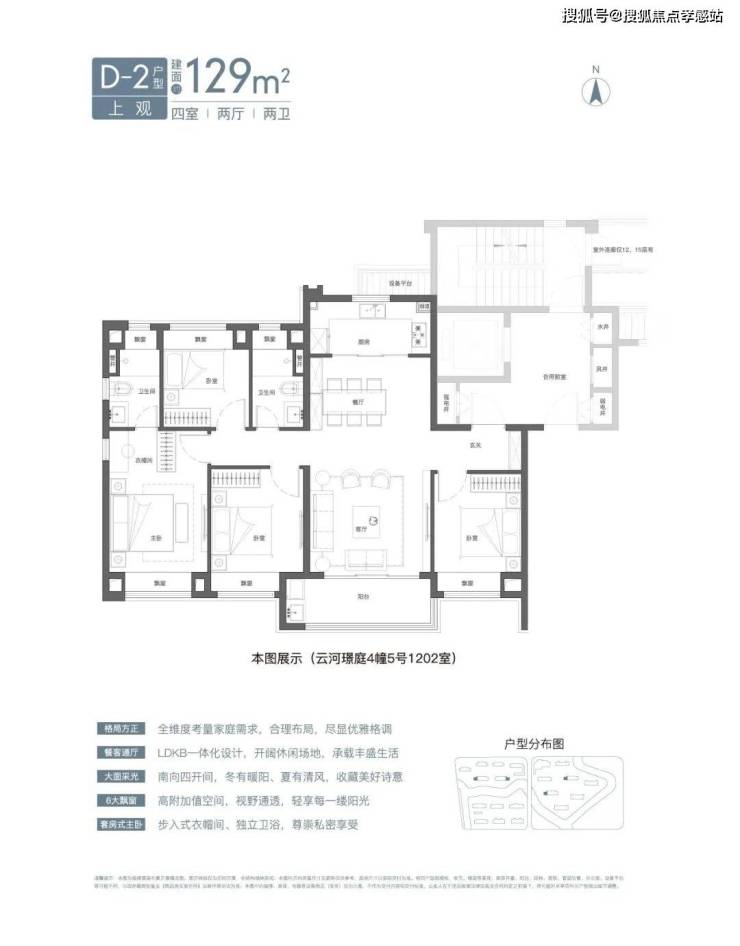 预算充足的小伙伴,可以选 建面约129㎡4房,经典的三卧朝南、边套观景户型。