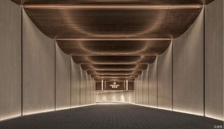 车辆缓缓驶入地库,迎宾坡道消除传统思维中对“星空顶”的奢华执念,以极具亲切感的姿态,展开归家序幕。古铜色铝板拼接成圆弧阵列,形似海浪轻抚,经手工拼接,与关永权的泛光设计融为一体,回家的光线并非刺眼的亮光,更有归家的温馨感与层次。