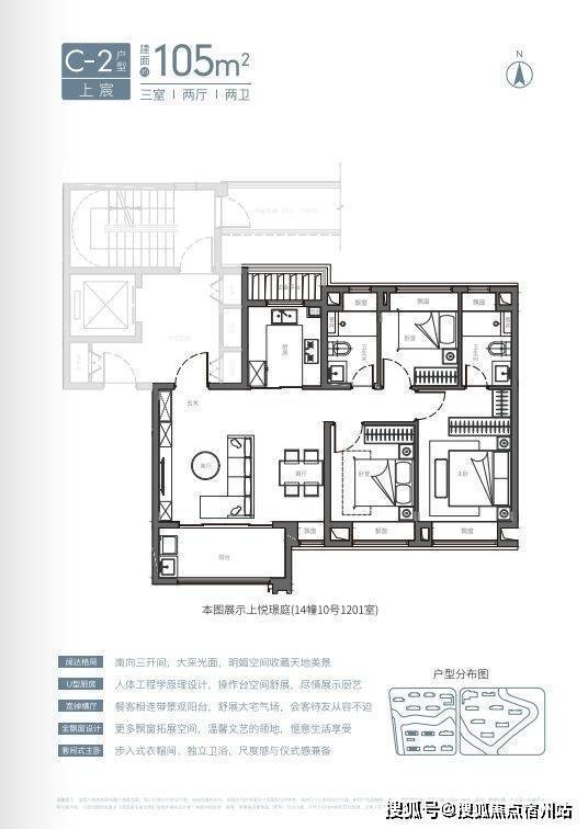 建面约105㎡3房2卫: 项目建面约105㎡3房2卫有两种风格(宽厅、竖厅),尤其是宽厅户型,设计格外惊艳。