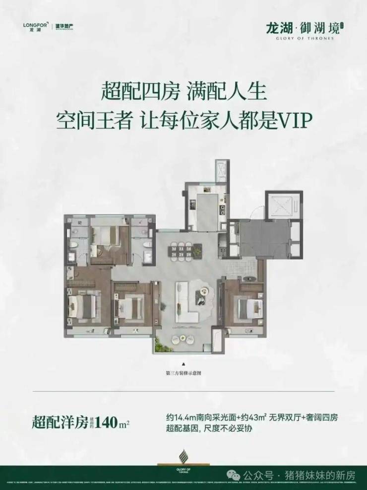 约 140 ㎡超配四房,独立入户玄关,奢阔双厅南北通透,还可改造成约8m巨幕宽厅,部分楼栋还是奉贤新城核心区罕见的洋房业态。