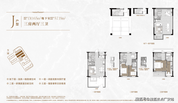 一楼和地下室主社交和志趣,二楼是子女的房间,三楼是主人休憩区.
