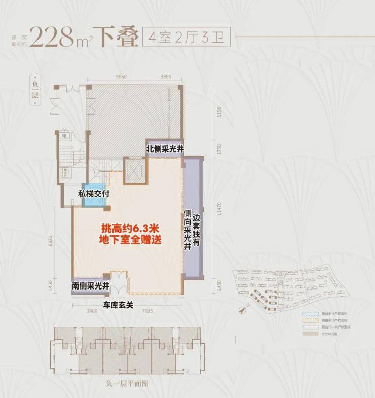 下叠户型地下单层面积约120㎡,层高达约6.3米,可以做双层使用,增加夹层后,地下空间可拓展至超200㎡,丰富的灵动空间足以满足业主的各类喜好!