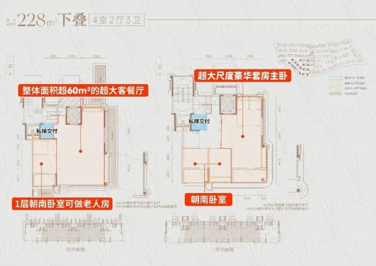 ①建面约228㎡下叠户型详细分析: