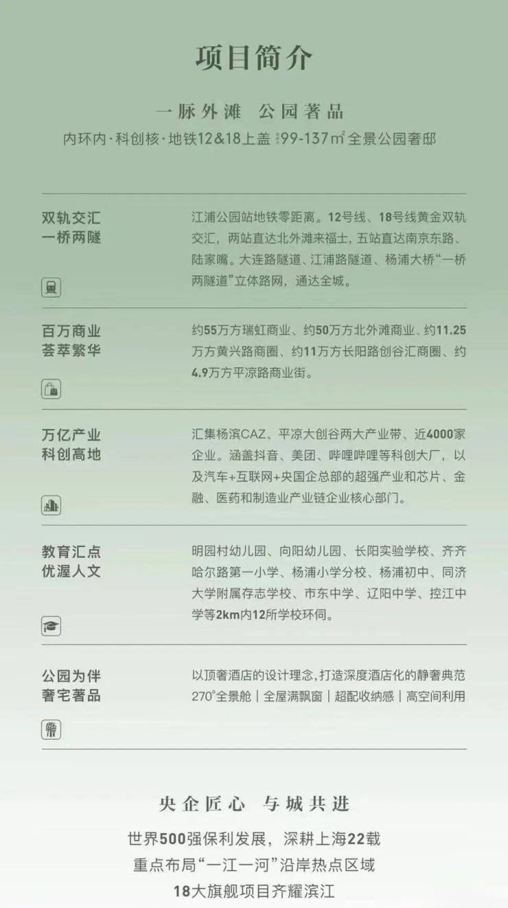 保利外滩启PARK77,是大连路总部集群、长阳创谷、杨浦滨江产业带这三大产业共同的芯,凭借极近距离和优越区位,成为三大产业区人才居住优选之地,也是项目未来价值保障。