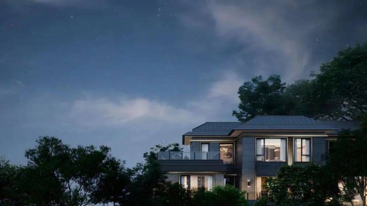 经典三段式别墅立面及大窗墙比,实现居住与自然的延伸;中灰色石材为基座,奢石宁静与土地矜贵互为映衬。