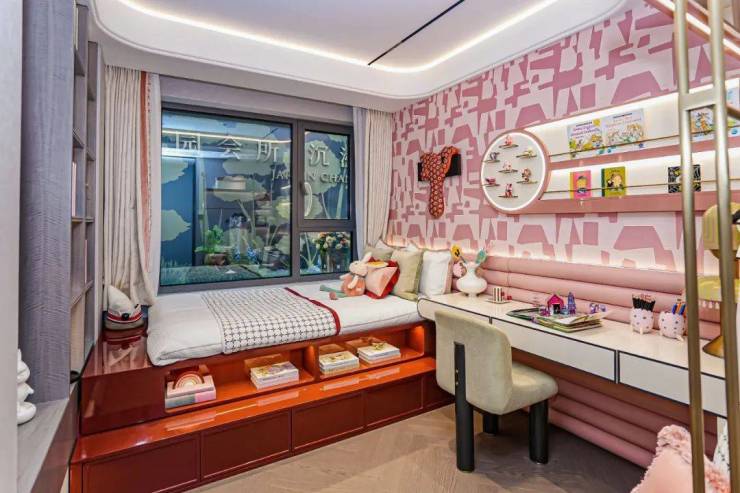 北向卧室的S墙设计,则可以做成一整面的收纳架,书籍或玩具都有了足够的盛放空间。