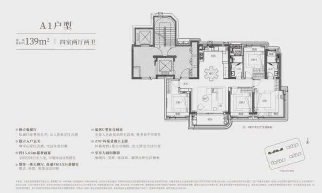 4#楼户型为建面约139㎡四房,✅✅中环铂樾售楼处电话:400-8787-740✅✅拥有“个性大四房+15.05米IMAX大面宽+一梯一户(边套)+270°转角飘窗”构建纯粹改善设计。